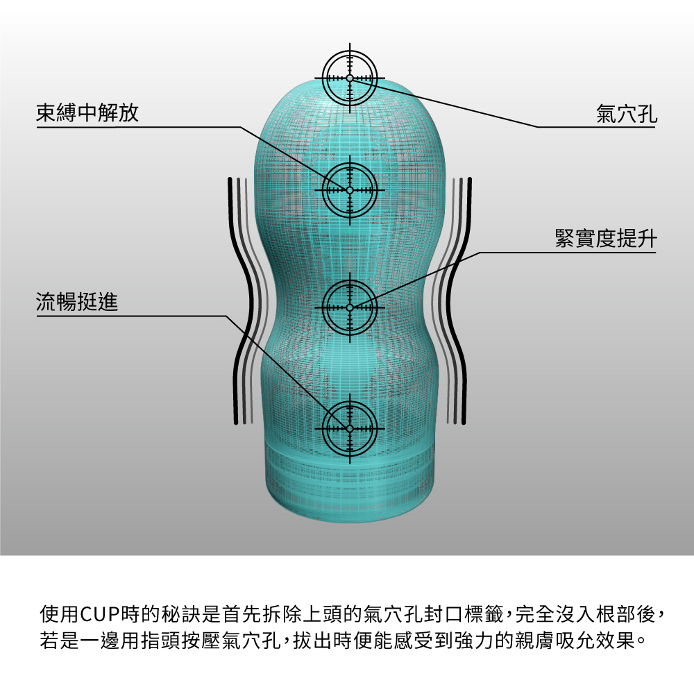 高彈力的材質和內部結構給予的強烈刺激,加上高級泡棉造成的適當緩衝效果,感受到的不單只是緊實,而是產生出深度吸允的頂級快感。